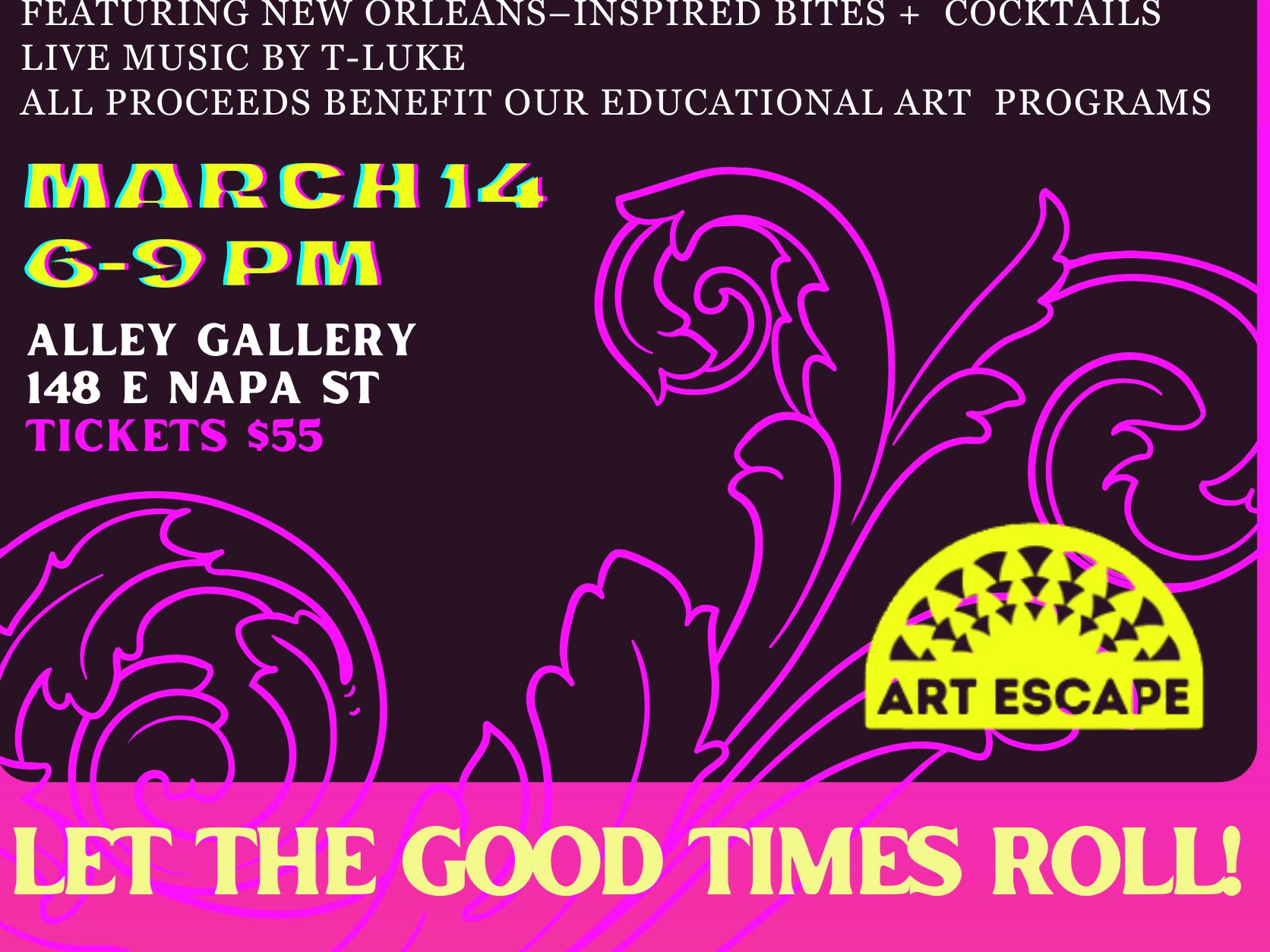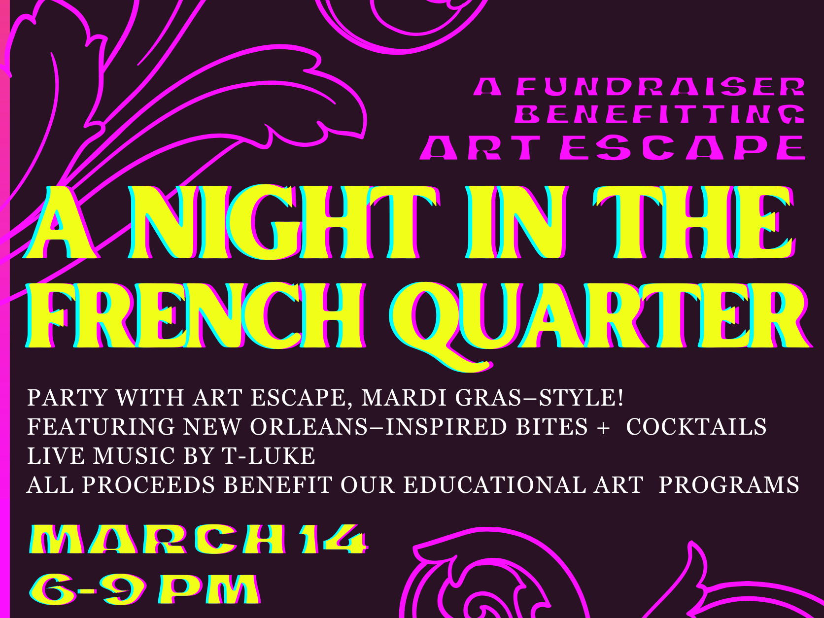 Join Art Escape for A Night in the French Quarter, a festive Mardi Gras–inspired fundraiser celebrating art, community, and good times.