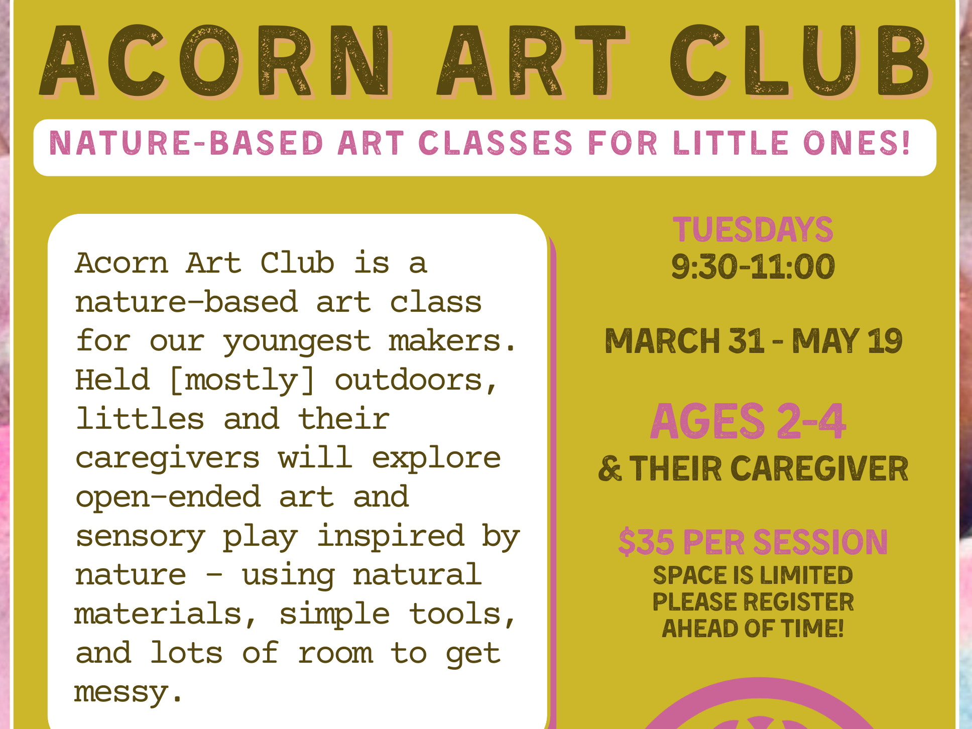 Acorn Art Club is a nature-based art experience for our youngest makers, held mostly outdoors. The class focuses on open-ended art and sensory exploration using natural materials and simple tools, with an emphasis on process over product, curiosity, and joyful mess-making. ---Español--- Club de Arte en la Naturaleza Acorn Art Club es una experiencia artística basada en la naturaleza para nuestrxs creadorxs más pequeñxs, que se lleva a cabo mayormente al aire libre. La clase se enfoca en el arte de exploración abierta y sensorial, utilizando materiales naturales y herramientas sencillas, con énfasis en el proceso más que en el resultado, la curiosidad y el disfrute de ensuciarse mientras se crea.