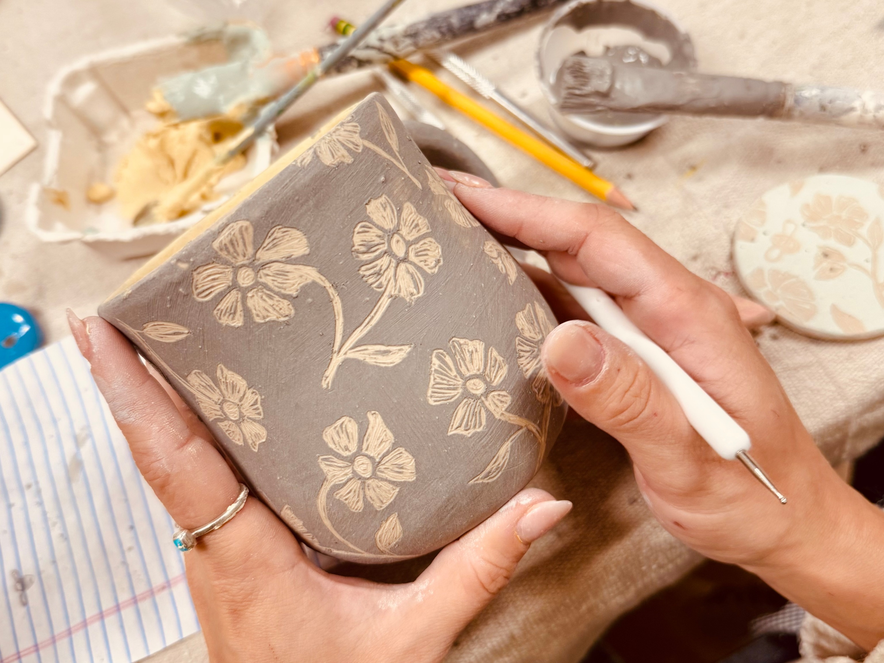 Join Kelly from No Peach Ceramics for a hands-on ceramic carving class. Sgraffito is an ancient technique of surface decoration that involves scratching or carving through a layer to reveal a contrasting color beneath. During the course of this 3-hour workshop, we will cover the fundamentals of which tools and techniques to best apply (and then remove) slips and underglazes to a pre-prepared clay "canvas". Demonstrations of when and how to carve successfully will be supplemented with in-depth advice on each aspect of the sgraffito process. All experience levels are welcome! You will be provided with materials, tools, and forms to practice sgraffito and make your own unique platter. Bringing inspiration photos and design ideas is welcomed and encouraged! We will be providing one pre-prepared raw clay platter per student to use during the course. After the class, we will fire your finished piece, and it will be ready for pick up within 2-3 weeks. —Español— ¡Acompaña a Kelly de No Peach Ceramics para una clase de tallado en cerámica! El Esgrafiado es una técnica ancestral de decoración de superficies que consiste en raspar o tallar una capa para revelar un color contrastante subyacente. Durante este taller de 3 horas, cubriremos los fundamentos de las herramientas y técnicas para aplicar (y luego eliminar) mejor los subglaceados sobre un "lienzo" de arcilla previamente preparado. Se mostrarán demostraciones de cuándo y cómo tallar con éxito, además de consejos detallados sobre cada aspecto del proceso de esgrafiado. ¡Todos los niveles de experiencia son bienvenidos! Se te proporcionarán materiales, herramientas y moldes para practicar el esgrafiado y crear tu propio plato único. ¡Te animamos a que traigas fotos inspiradoras e ideas de diseño! Proporcionaremos una pieza de arcilla cruda previamente preparada por estudiante para usar durante el curso. Después de la clase, hornearemos tu pieza terminada y estará lista para recoger en un plazo de 2 a 3 semanas.