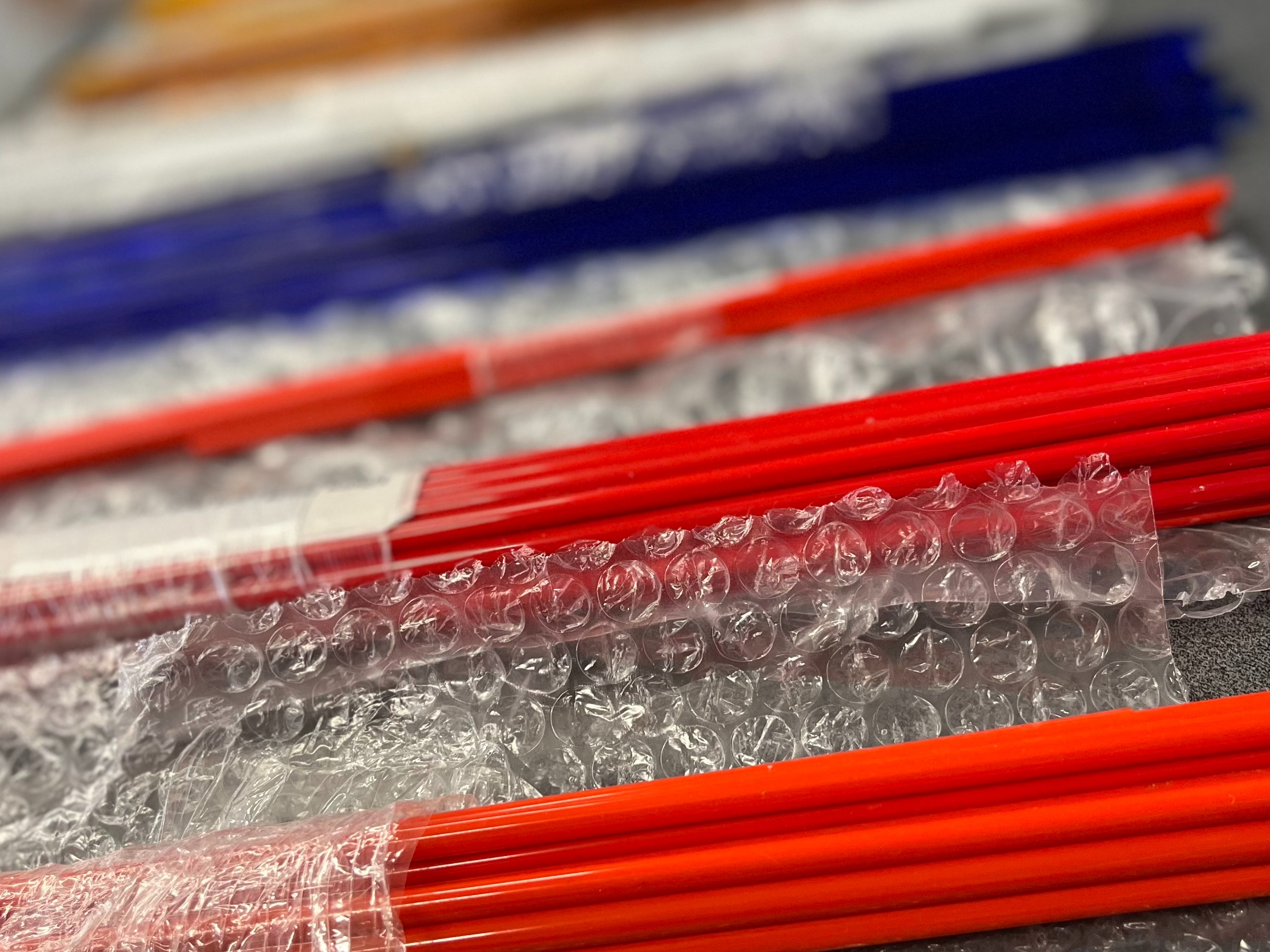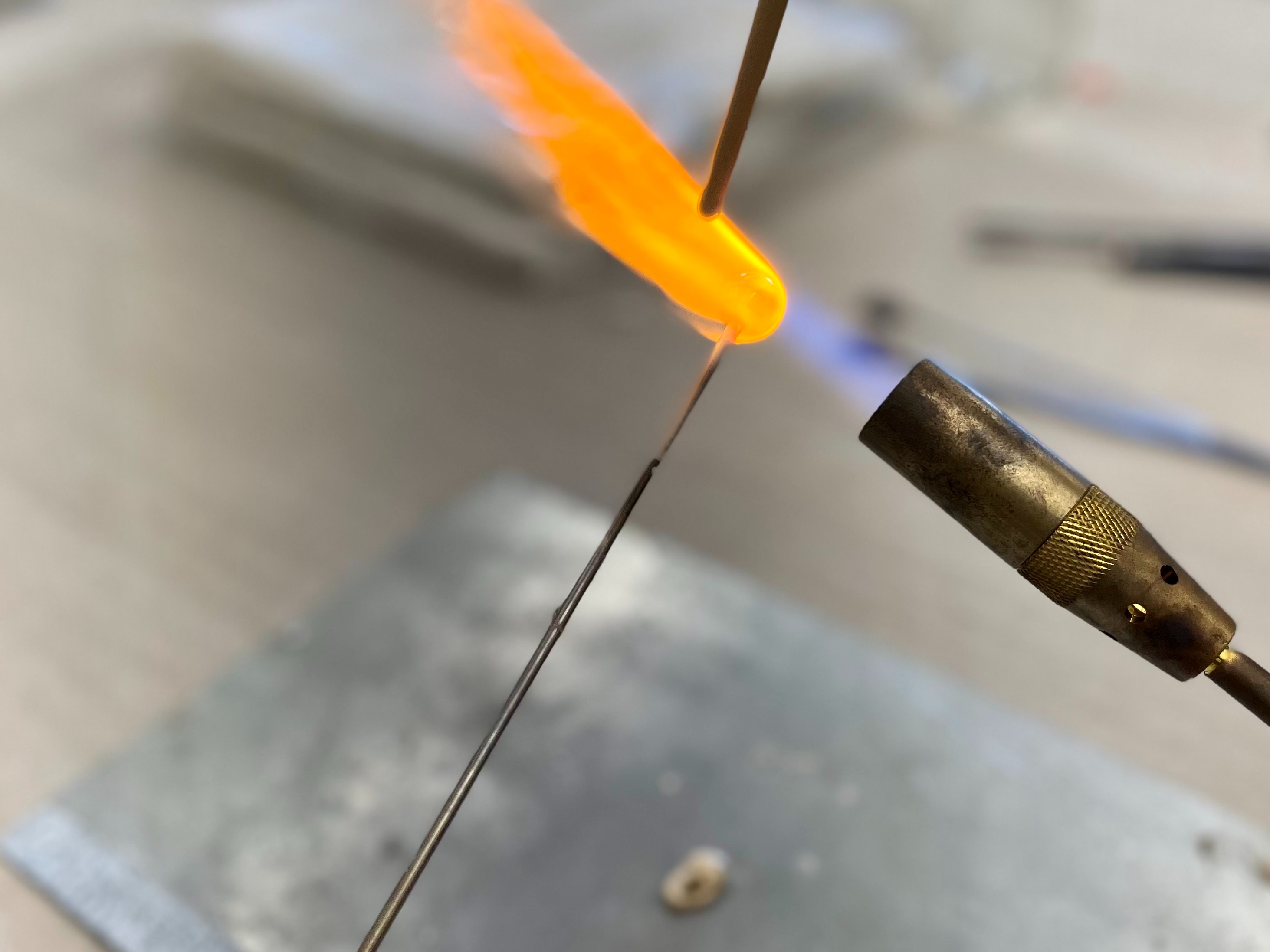 Cada participante utiliza una llama de soplete para fundir y dar forma a varillas de vidrio de colores.