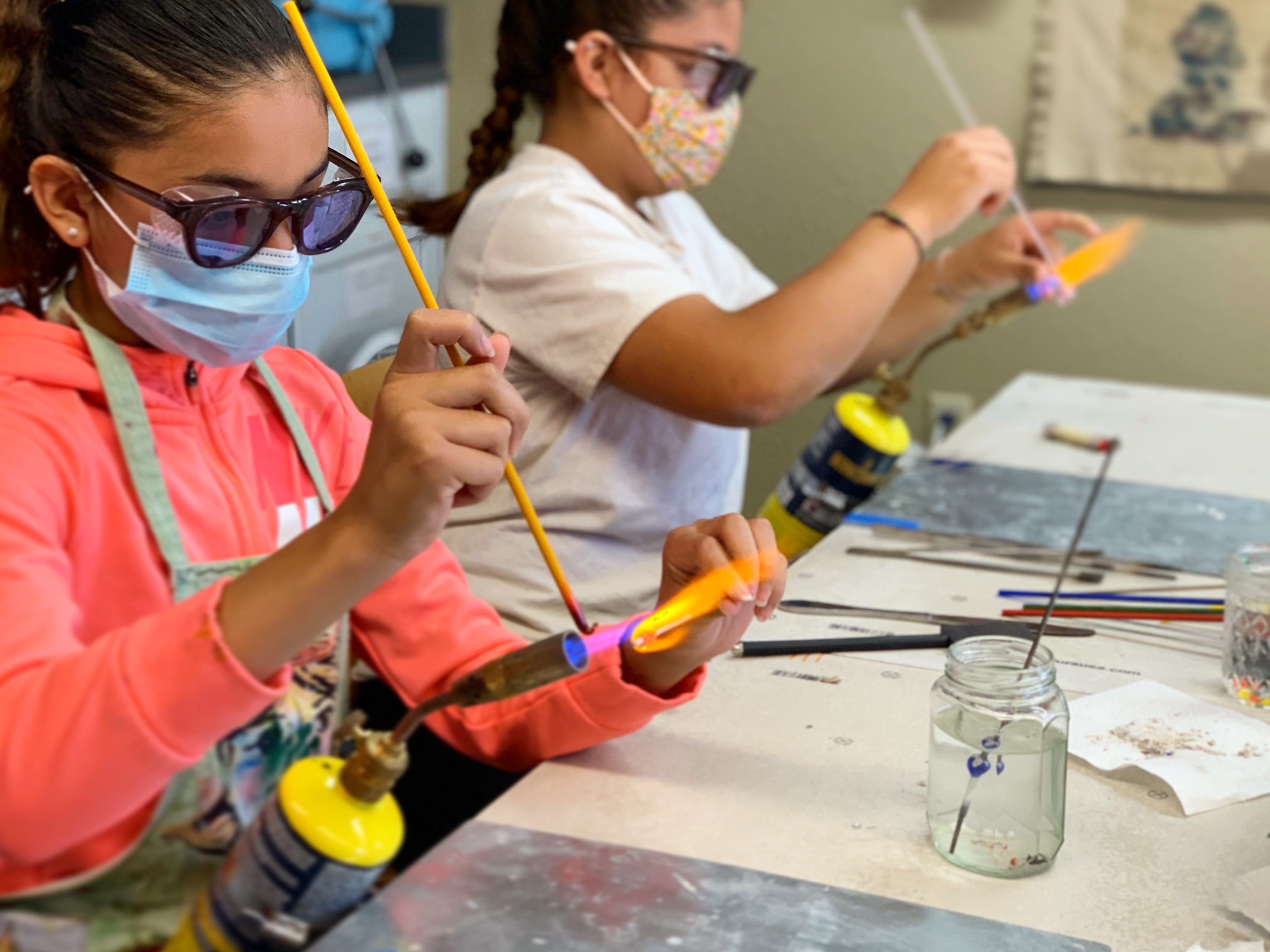 Each participant uses a torch flame to melt and shape rods of colorful glass.